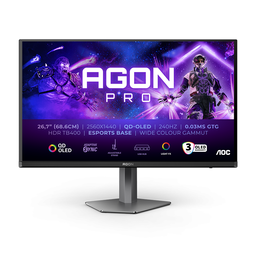 MONITOR AOC LED AG276QZD2 AGON PRO 26.7" 2560x1440 QD-OLED Adaptive Sync 240Hz 0.03ms 250 cd/m2 3-sided frameless FULL ERGO 2xHDMI 2xDP USB Hub