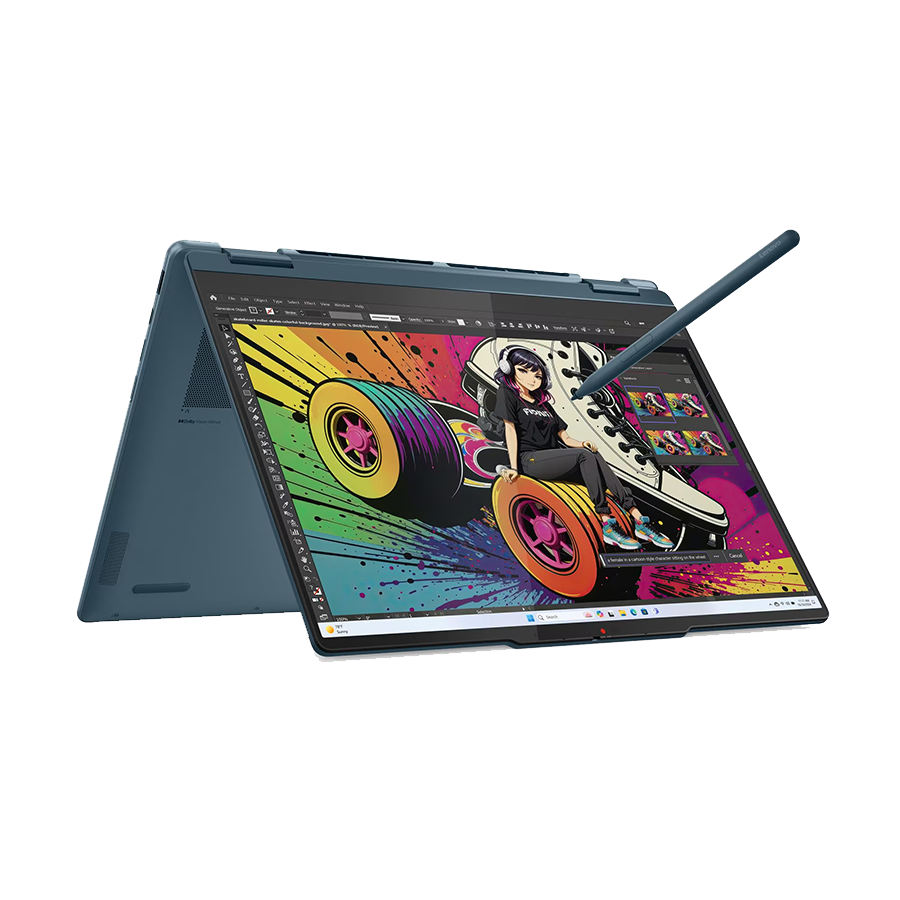 Lenovo Yoga 7 2-in-1 14AKP10 83JR0027SC 14" WUXGA OLED Touch 600nits, AMD Ryzen 7 350(Ai) 24GB DDR5/1TB SSD M.2,/Tidal Teal/Alu/2y Camera 5.0MP + IR with Privacy Shutter Display 14" WUXGA (1920x1200) OLED 600nits (peak) / 400nits (typical) Glossy / Anti-fingerprint, 100% DCI-P3, 60Hz, Dolby Vision®, TÜV Low Blue Light, DisplayHDR™ True Black 500, Glass, Touch Touchscreen Keyboard Backlit, SlovenianOGM, 10-point Multi-touch Pen Lenovo® Yoga® Pen (Luna Grey) WLAN + Bluetooth Wi-Fi® 7, 802.11be 2x2 + BT5.4 WWAN WWAN Not Supported Ethernet No Onboard Ethernet Standard Ports 1x USB-A (USB 5Gbps), Always On 1x USB-C® (USB 10Gbps), with USB PD 45-65W and DisplayPort™ 1.4a 1x USB-C® (USB 10Gbps), with USB PD 45-65W and DisplayPort™ 2.1 UHBR10 1x HDMI® 2.1, up to 4K/60Hz 1x Headphone / microphone combo jack (3.5mm) 1x microSD card reader